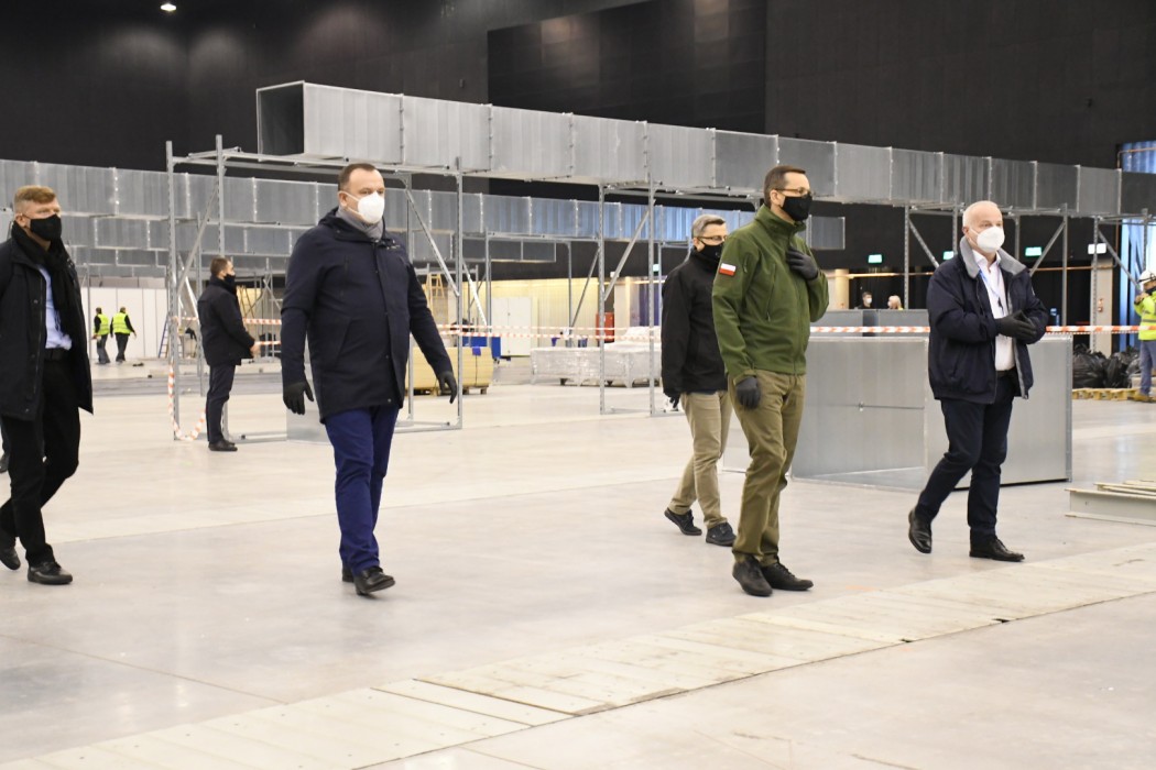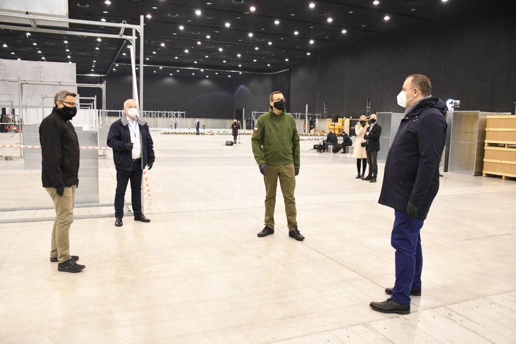 Dziś do MCK przyjechał premier Mateusz Morawiecki. Na miejscu budowy szpitala byli także marszałek województwa Jakub Chełstowski oraz wojewoda Jarosław Wieczorek.