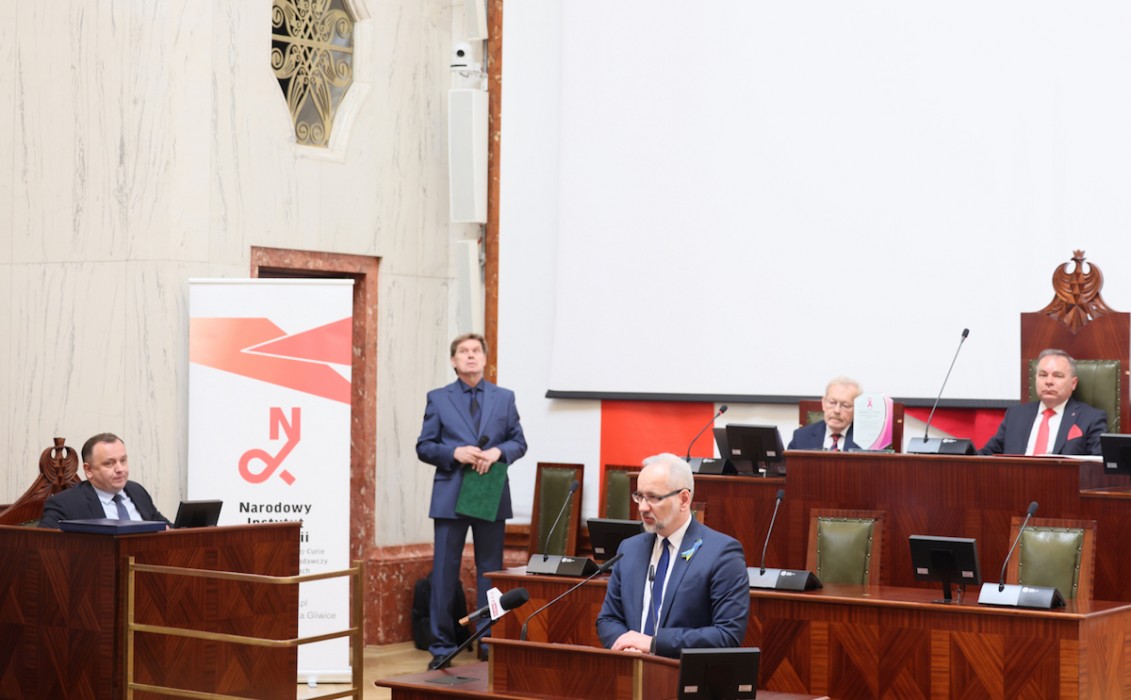 - Instytut Onkologii w Gliwicach to placówka, która znakomicie wpisuje się w główne cele polityki zdrowotnej, ukierunkowane są na zapewnienie powszechności dostępu do profilaktyki i świadczeń zdrowotnych oraz podnoszenie jakości usług medycznych – mówił w wystąpieniu marszałek Jakub Chełstowski - W zakresie ochrony zdrowia województwo śląskie wyróżnia się nie tylko w skali kraju, ale także na arenie międzynarodowej. W regionie funkcjonuje szereg jednostek ochrony zdrowia na wysokim poziomie, które mogą pochwalić się specjalistycznym sprzętem i wysoko wykwalifikowaną kadrą medyczną. Onkologia jest dziedziną, w której region odnosi znaczące sukcesy. Centrum Onkologii – Instytut Marii Skłodowskiej-Curie w Gliwicach zasługuje na szczególną uwagę jako jedna z najnowocześniejszych placówek w kraju. Nowoczesne zaplecze aparaturowe oraz wyspecjalizowany zespół zapewniają pacjentom z całego kraju diagnostykę i leczenie na poziomie standardów światowych, najwyższą precyzję i technologię, wysoką skuteczność i unikalne metody leczenia. Ponadto, co godne podkreślenia, z godnym podziwu oddaniem otacza pacjentów profesjonalną opieką, stanowiąc przykład funkcjonowania służby zdrowia opartej na pasji, zaangażowaniu i trosce o pacjenta zarówno od strony naukowej, jak i medycznej.