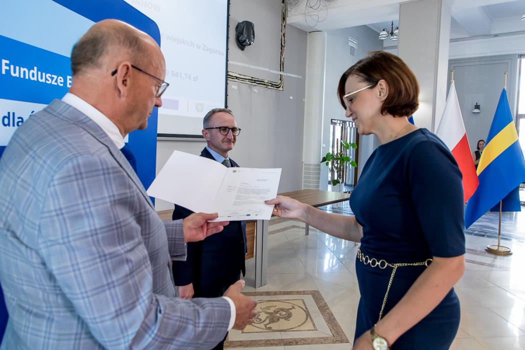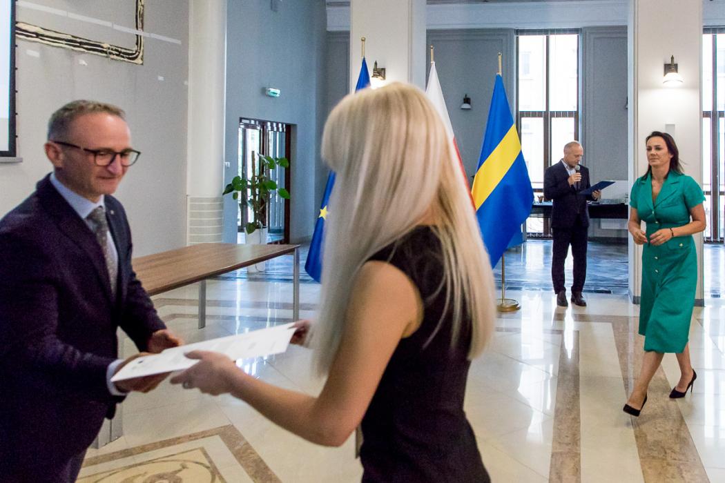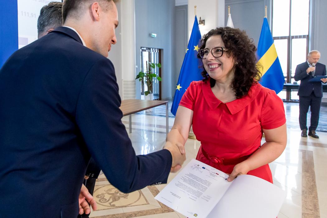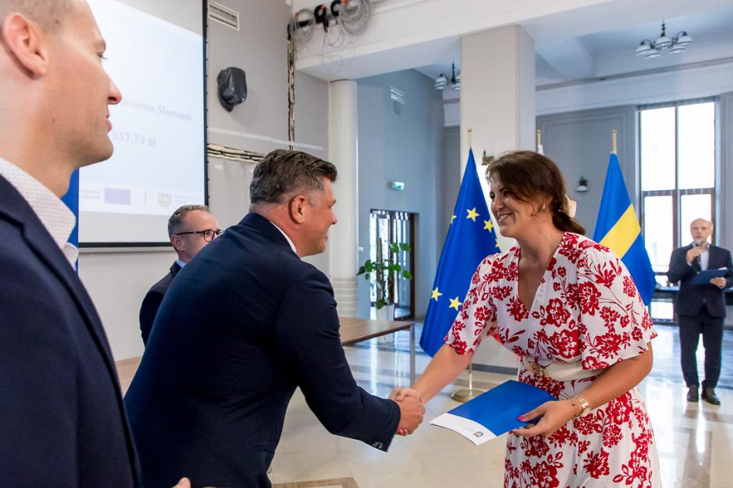 Osoby wręczające oraz beneficjenci odbierający listy gratulacyjne. Wręczenie listów gratulacyjnych w związku z uzyskaniem dofinansowania fot. Tomasz Żak / UMWS