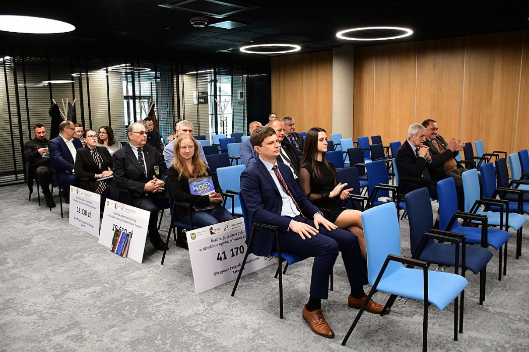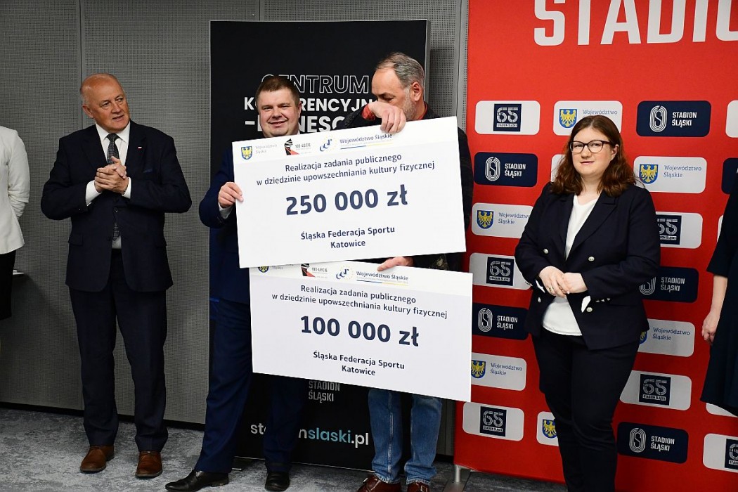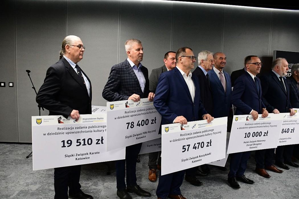 Symboliczne czeki wręczono podmiotom dofinansowanym w tegorocznym programie wsparcia dla okręgowych związków i stowarzyszeń sportowych oraz podmiotom strzegącym bezpieczeństwa osób przebywających w górach i nad wodą. W wydarzeniu uczestniczyli Wojciech Kałuża, wicemarszałek województwa śląskiego, Beata Białowąs, członek Zarządu województwa, Jan Kawulok przewodniczący Sejmiku oraz radni Sejmiku Bartłomiej Kowalski, Julia Kloc-Kondracka, Alina Nowak i Jarosław Szczęsny.