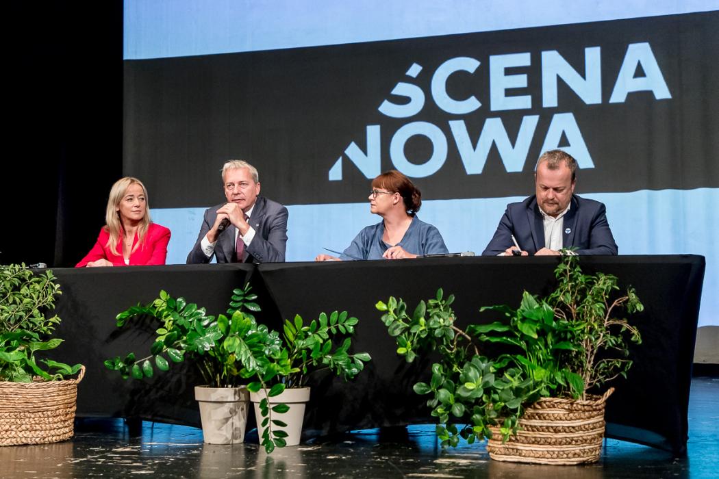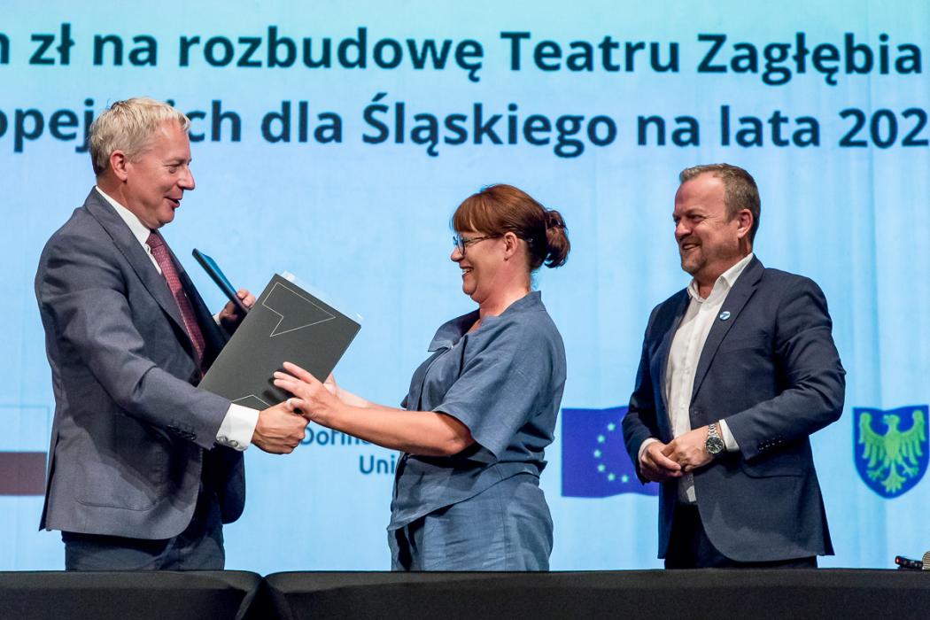 W uroczystym podpisaniu umowy na dofinansowanie rozbudowy teatru uczestniczyli marszałek Wojciech Saługa, prezydent Sosnowca Arkadiusz Chęciński oraz przewodnicząca rady miejskiej w Sosnowcu Anna Jedynak-Rykała i dyrektor Teatru Zagłębia Iwona Woźniak.