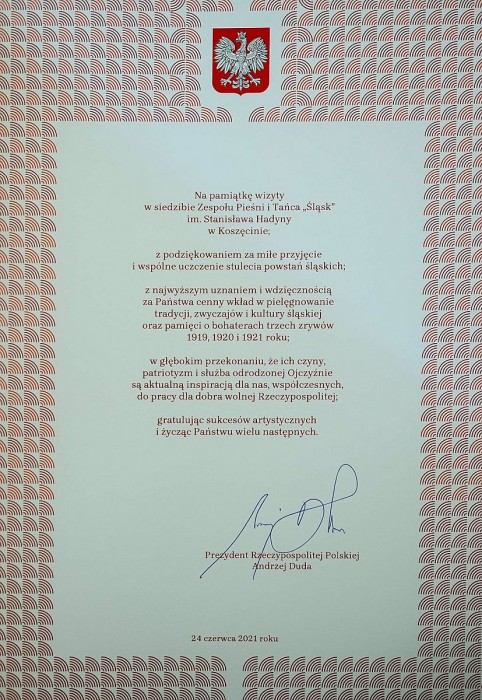 „Pozyskanie Śląska miało fundamentalne znaczenie dla rozwoju Rzeczypospolitej. To tutaj biło serce polskiego etosu pracy. To także tutaj było wielkie bogactwo naturalne obok bogactwa ludzkiego. Dziękuję, że zespół „Śląsk" pokazuje to bogactwo i utrwala kulturę i polskość Śląska” – powiedział prezydent Duda.