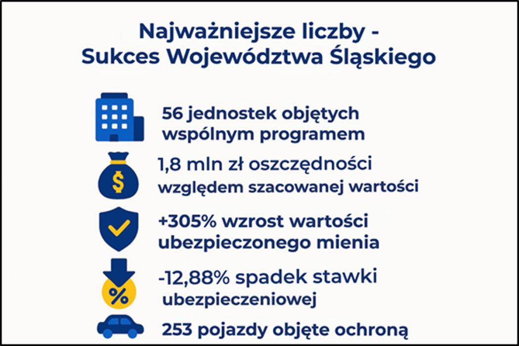 Dzięki odpowiednio przygotowanym zapisom określającym warunki ubezpieczenia i prezentacji ryzyka, będącego przedmiotem ubezpieczenia, łączna wartość najkorzystniejszych ofert okazała się o 1,8 mln zł niższa od szacowanej wartości zamówienia, co oznacza realne oszczędności dla budżetu Województwa Śląskiego.