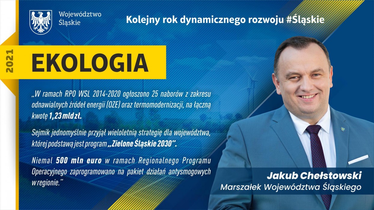 Od początku kadencji we współpracy z Komisją Europejską i rządem RP władze województwa podejmują konkretne działania mające na celu pozyskanie funduszy dla samorządów oraz mieszkańców na odnawialne źródła energii, walkę z niską emisją, ekologiczny transport czy wymianę źródeł ciepła. Blisko pół miliarda euro w ramach RPO Województwa Śląskiego zaprogramowano na pakiet działań antysmogowych w regionie. Na dofinansowanie mogły liczyć projekty dotyczące budowy i modernizacji instalacji do produkcji energii. Wspierane były działania w zakresie infrastruktury transportu zbiorowego (np. zintegrowane centra przesiadkowe – w tym dworce autobusowe i kolejowe, parkingi, drogi rowerowe), zakup taboru autobusowego i tramwajowego, wdrażanie inteligentnych systemów transportowych oraz wymiana oświetlenia w gminach na instalacje o wyższej efektywności energetycznej. Duży nacisk położono na projekty edukacyjno-informacyjne podejmowane na rzecz uświadamiania mieszkańców o szkodliwym wpływie smogu na ich zdrowie, promowania działań prozdrowotnych i proekologicznych, ochrony i poprawy stanu zdrowia mieszkańców. W ramach akcji „MOGĘ! Zatrzymać SMOG” do 571 przedszkoli przekazano łącznie 1379 oczyszczaczy powietrza. W efekcie realizacji projektu „InfoSMOG-MED” powstała z kolei platforma cyfrowa i aplikacja Śląskie SMOGSTOP i przeprowadzono kampanię „Śląskie. Zmieniamy powietrze na dobre”. Jej celem było zwiększenie świadomości na temat negatywnego wpływu zanieczyszczonego powietrza na zdrowie i promocja zachowań prozdrowotnych i proekologicznych. Sejmik przyjął „Program ochrony powietrza dla Województwa Śląskiego do roku 2026”. W ramach konsultacji umowy partnerstwa na lata 2021-2027 zarząd województwa stara się o dodatkowe 1,2 mld euro z funduszy UE na walkę z niską emisją. Środki pozwoliłaby samorządom dofinansować wymianę źródeł ciepła u mieszkańców. Na ten cel zostaną przeznaczone też środki w ramach Regionalnego Programu Operacyjnego, Funduszu Sprawiedliwej Transformacji oraz Krajowego Planu Odbudowy.