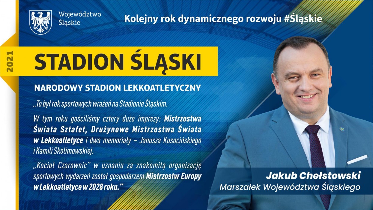 To był rok sportowych wrażeń na Stadionie Śląskim. Byliśmy gospodarzem aż czterech dużych imprez: Mistrzostw Świata Sztafet, Drużynowych Mistrzostw Świata w Lekkoatletyce, podczas których biało-czerwoni sięgnęli po złoty medal i dwa memoriały – Janusza Kusocińskiego i Kamili Skolimowskiej. Ostatnia z imprez była podziękowaniem dla naszych medalistów z Tokio, wśród których nie zabrakło ambasadorów Województwa Śląskiego i przyciągnęła blisko 35 tysięcy widzów. „Kocioł Czarownic” w uznaniu za znakomitą organizację sportowych wydarzeń został gospodarzem Mistrzostw Europy w Lekkoatletyce w 2028 roku. Przegląd Sportowy majowe Drużynowe Mistrzostwa Europy uhonorował prestiżowymi Złotymi Kolcami.